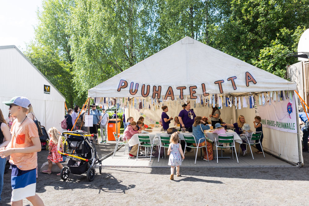 Puuhateltan ja Lastenteltan touhuihin voi osallistua yhdessä oman aikuisen kanssa, mutta lapset ovat lämpimästi tervetulleita myös itsekseen, kuitenkin oman aikuisen vastuulla.